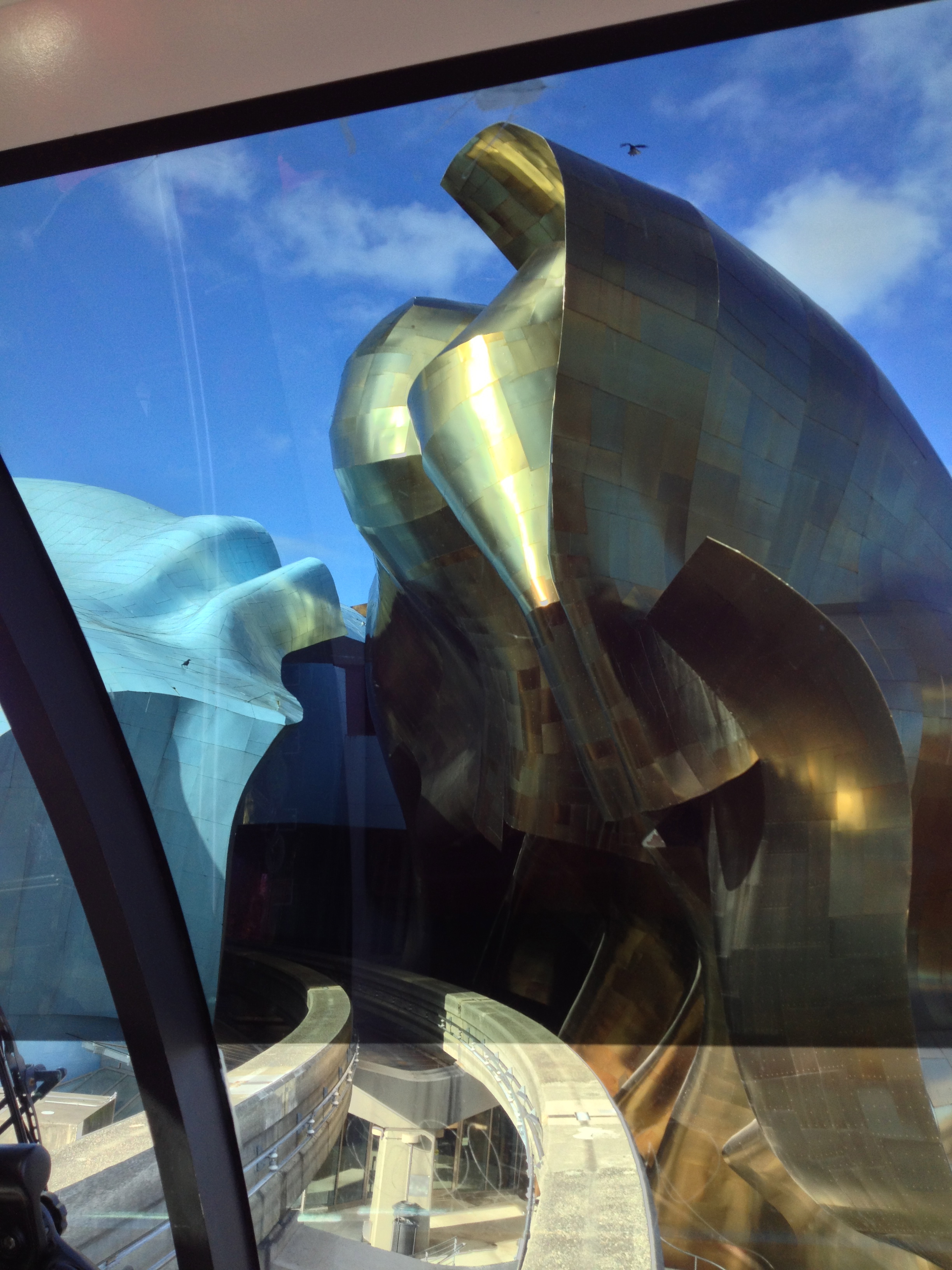 I went up the street a few blocks, then went left a few blocks and got on the monorail. It was built for the 1962 World’s Fair at the same time the Space Needle was built. That was kinda cool and very retro to say the least. Chris had mentioned the “music museum” and I had forgotten all about that until he mentioned it and said “you can’t miss it…” and he was right… we rounded a corner on the monorail and there it was.