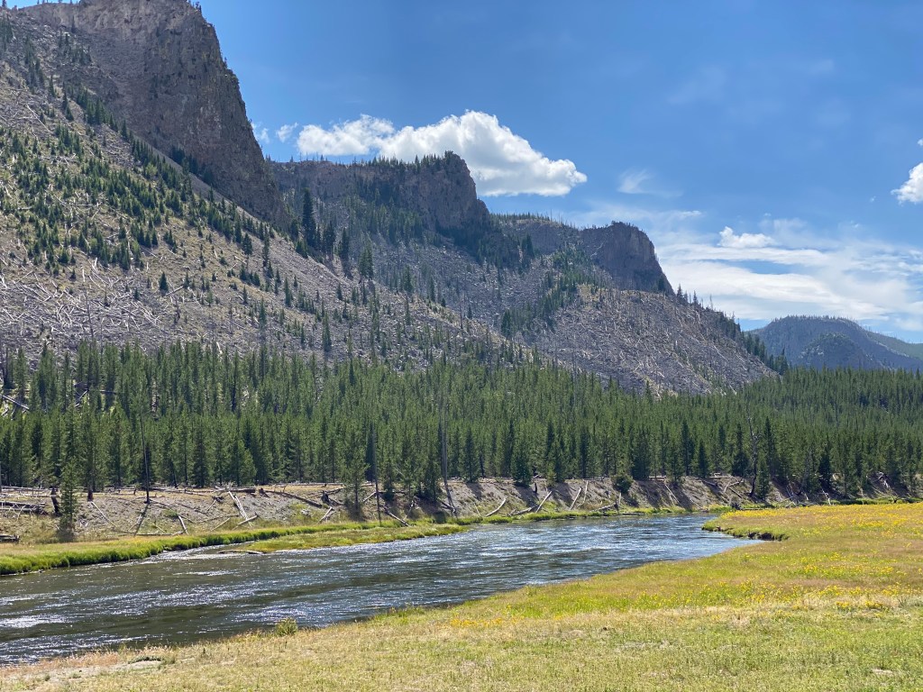 There are a lot of beautiful meadows in Yellowstone, mountains, and rivers along with the animals and geysers.