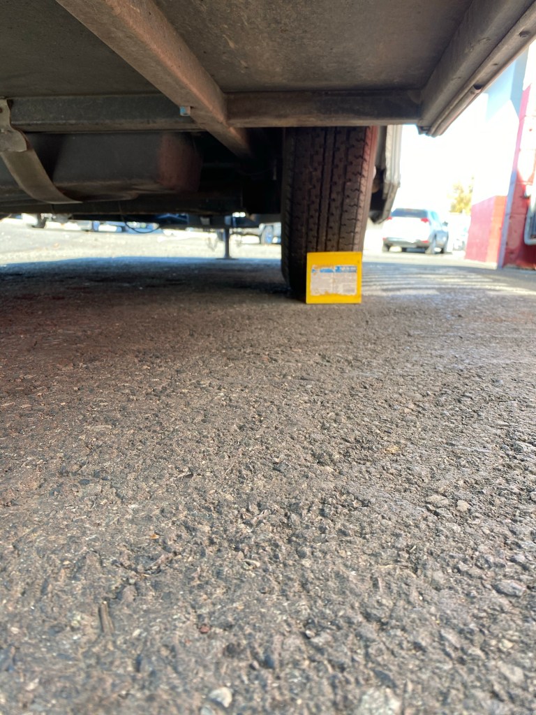 Smoke was billowing out of the passenger side tire on the trailer. I had stopped in the nick of time. It could have caught fire, locked up and caused an accident…any number of things – and all of a bad nature. Wheel bearing is cooked and the wheel is sitting odd: