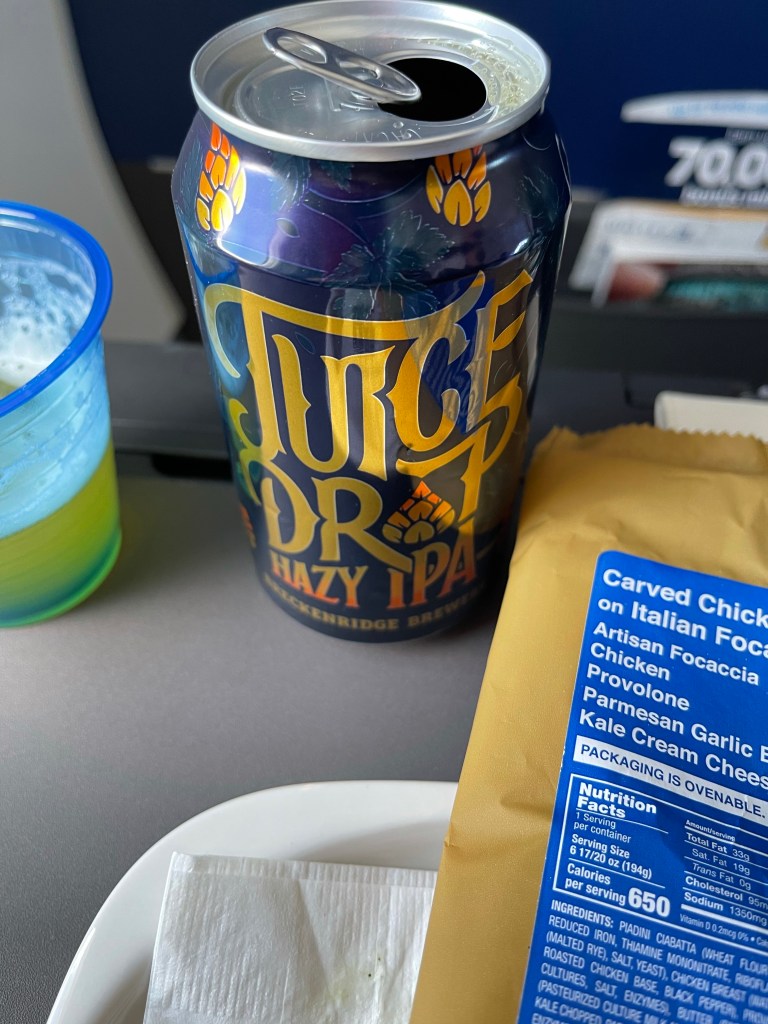 Had a pretty good warm chicken sandwich after we got in the air. Provolone on top of it with kale cream cheese. Pretty delicious. I ordered a Breckinridge Brewery IPA to go with it.