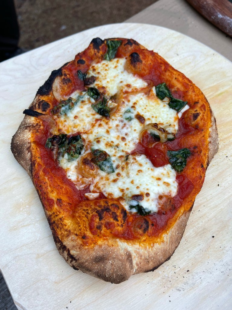 Last week I went to a friend’s house and we made pizzas in their new wood pellet pizza oven. Oh man…was it good. So good. Simple pizza with simple ingredients baked in a wood-fired oven. It really was very tasty – smoky and crispy yet chewy crust with sauce, fresh basil leaves, mozzarella, sautéed onion and spinach.