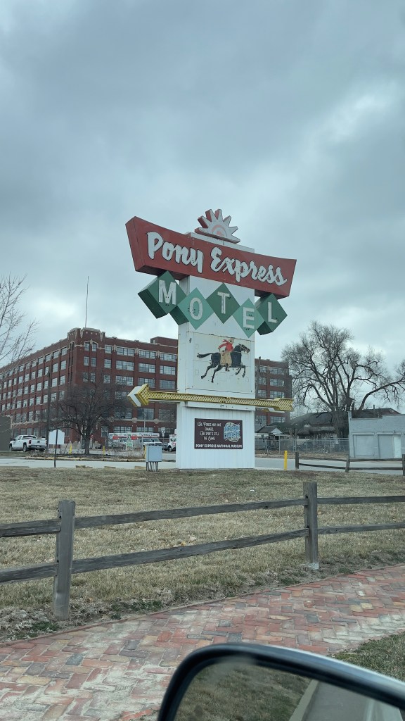 We hopped in the truck and I just drove around the block as there was something else I wanted to see. I saw an interesting old sign as I was first driving into the neighborhood and I wanted to go check it out some more. I did not realize it is in the parking lot of another part of the Pony Express Museum. It’s actually on the backside of the Museum.