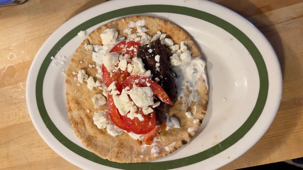 Today’s lunch turned out quite good for my first attempt at something like this. Lots of spices I have never used before went into this recipe but they certainly will be used again! I got eight kebabs out of the lb. of lamb, and total salt was a teaspoon for the entire recipe which is only 288mg each for my 8 servings. As one who limits daily sodium to no more than 1500mg this is a fairly decent meal. The lamb went on a pita with tomato, feta and tzatziki.