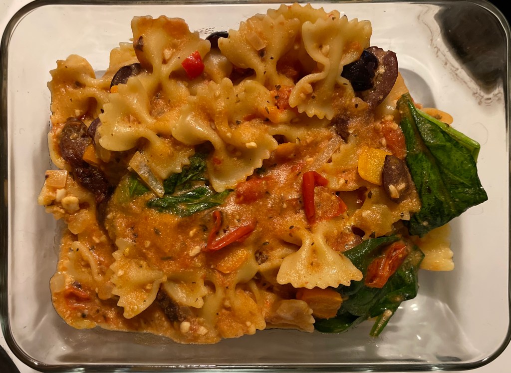 Tonight I used a recipe for baked feta pasta, but I didn’t follow it verbatim. I didn’t have a block of feta cheese (just some crumbled) so I added a few extras and made it my own. It turned out delicious and is pretty good as far as being healthy. There’s not much cheese in it at all.