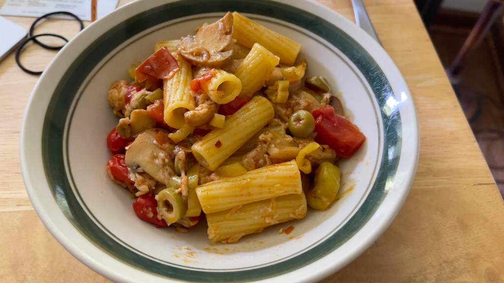 I tossed the rigatoni in the sauce and added a little pasta water to thicken it. Final touch was some all-natural Parmesan/Romano cheese to melt in and it was done.