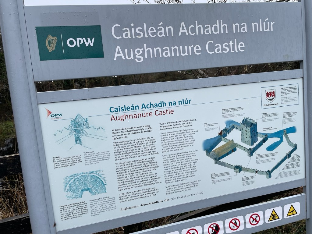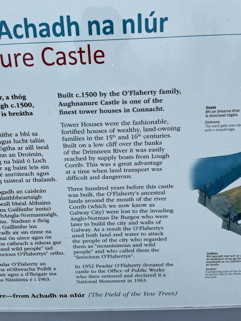 Just outside the front gate is a yew tree. It is a very large tree and is quite disfigured, which is common with yew trees as they get older. He told us that they think the tree is about 2000 years old and it is documented as being there when the castle was active. The name of the castle “Aughnanure” reflects this tree. Per Wikipedia – “…the name translates from the Gaeilge/Irish “Caisleán Achadh na nlubhar” as “Castle of the field of the yews”; and there was once an extensive yew forest stretching from the site half-way to Galway.“.
