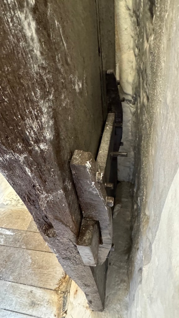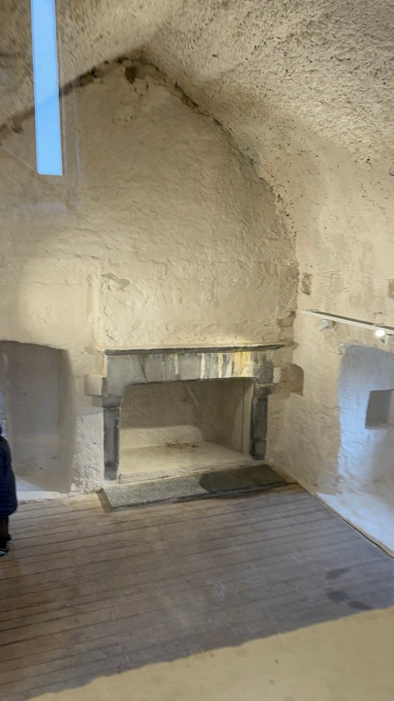 He talked about some of the construction methods used and interesting characteristics of the stonework. They used tricks from ancient Rome to fool the eye with respect to perspective, making the windows look the same size even though they weren’t. He said the stonework was basic, but any extra work cost more money and was a sign of bragging about your riches. So, if the stones were rough blocked that was the cheapest work. If the stones had smooth faces, that was extra. If the rock faces were “dimpled” that was more money. If there were carvings that was even more. This castle had carvings in the floors and the stairs and insides of some windows were carved or were dimpled. Finished stonework inside the window frames was major bragging rights.