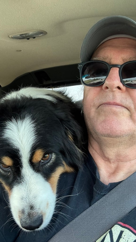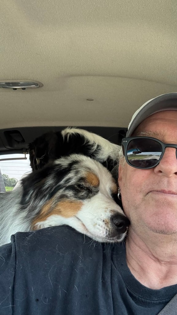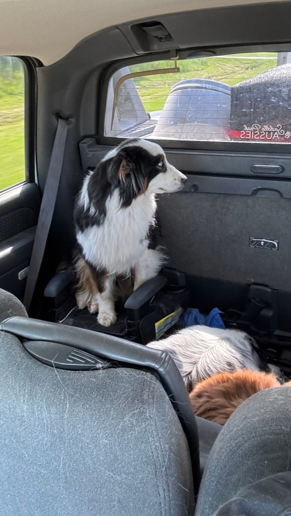 We got everything loaded up over 3-4 days, gave the truck a pat on the butt, and off it went…west into the sunset. I hauled my two dogs and four of her Aussies home with me, and she brought more up with her (she has 13 Aussies total). As you can see, they are a bit lovable: