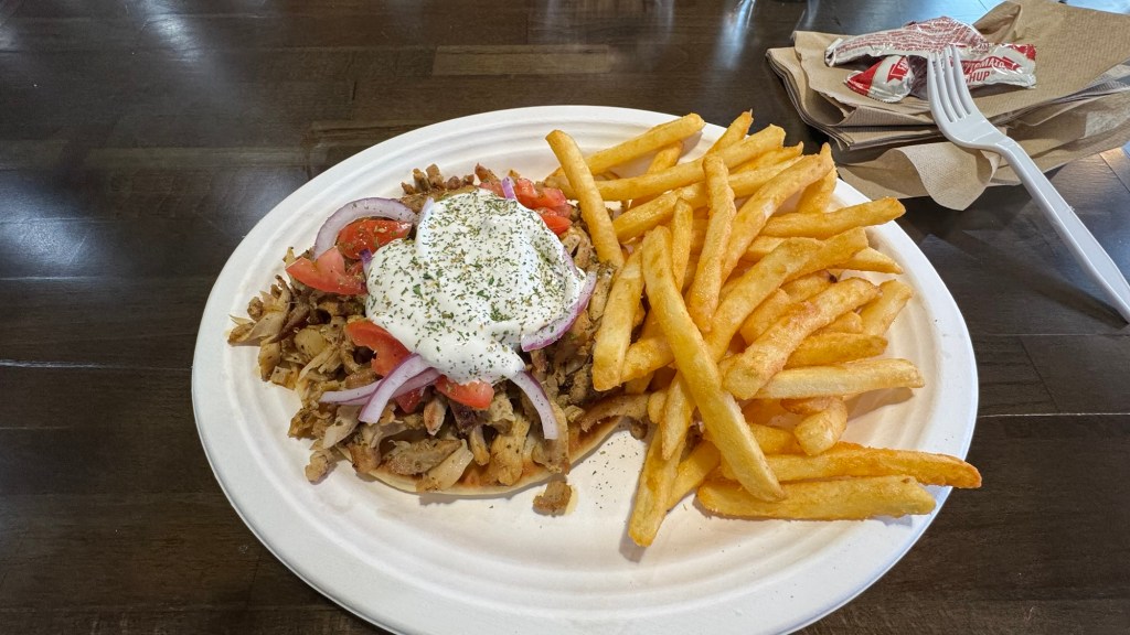 While I was waiting for my new truck to get ready I went for some food. I saw a place that I wanted to go to during past trips here called The Gyro Hub (no website and I am not on FB). I got a chicken gyro & fries plus two chocolate baklava.